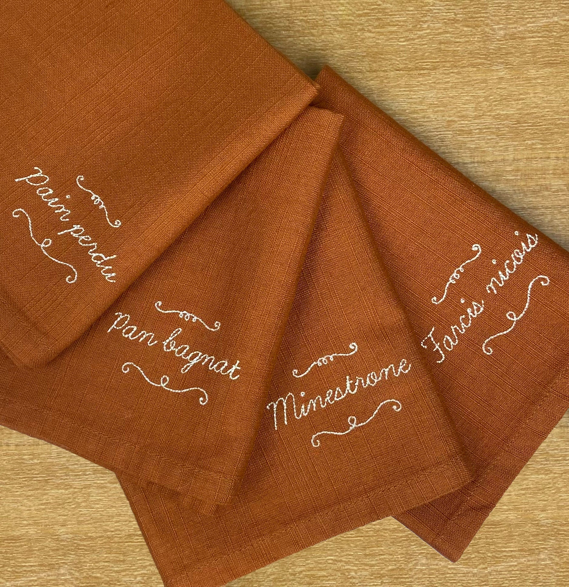 Les serviettes de table Noli sont en coton rouille tout doux. Ajoutez-y des prénoms, des souvenirs, des private jokes...