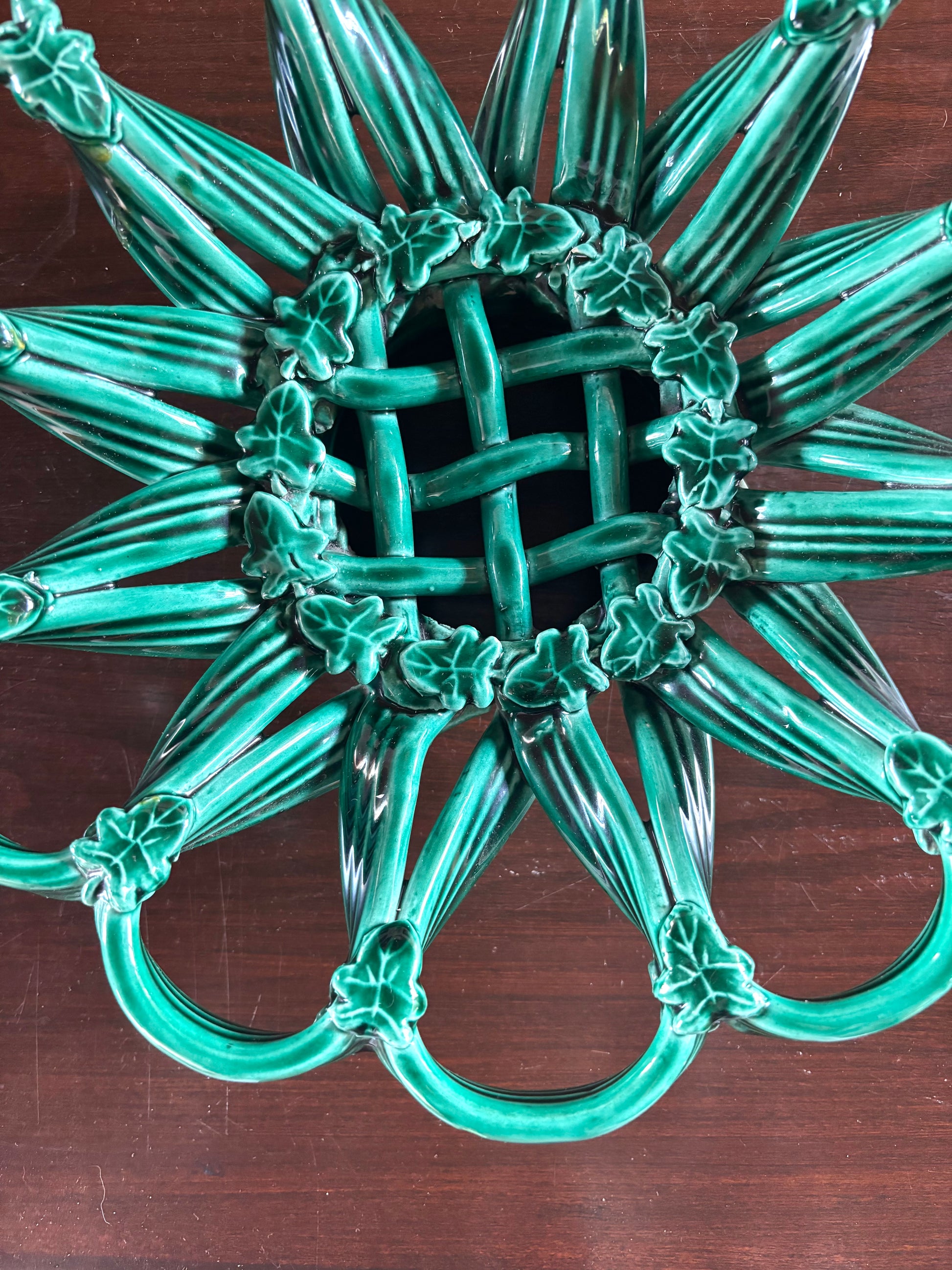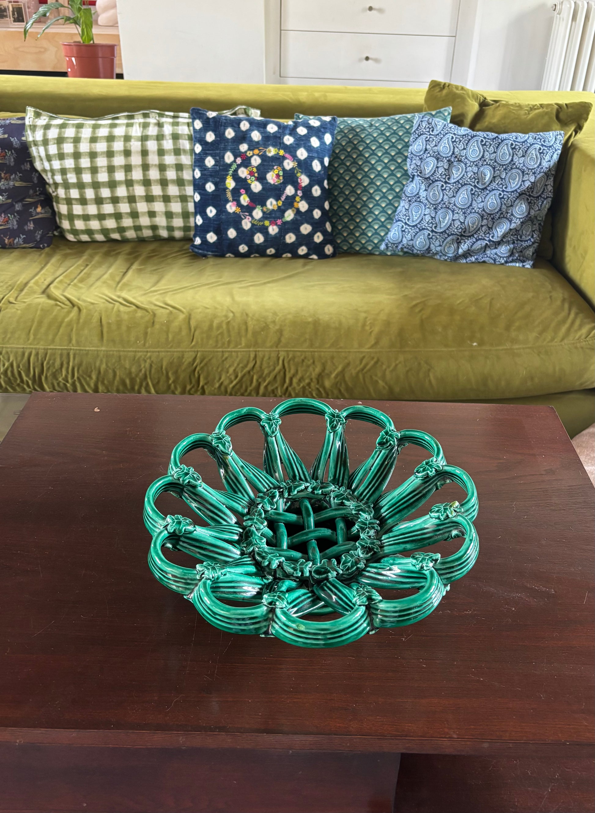 Superbe coupe en céramique de Vallauris au décor sculptural formant une rosace. Les courbes et les détails en relief lui donnent une allure presque végétale, tandis que l’émail vert profond capte magnifiquement la lumière.