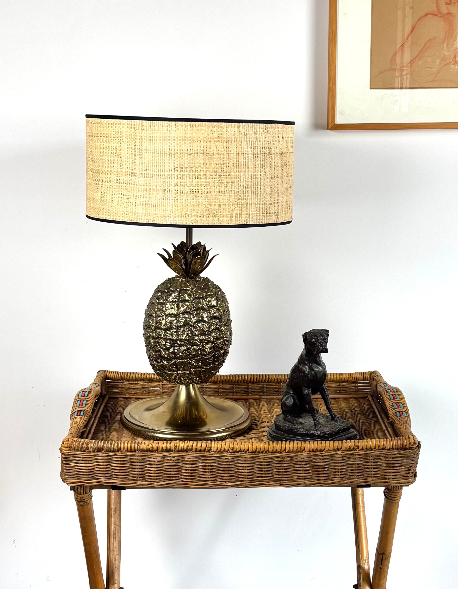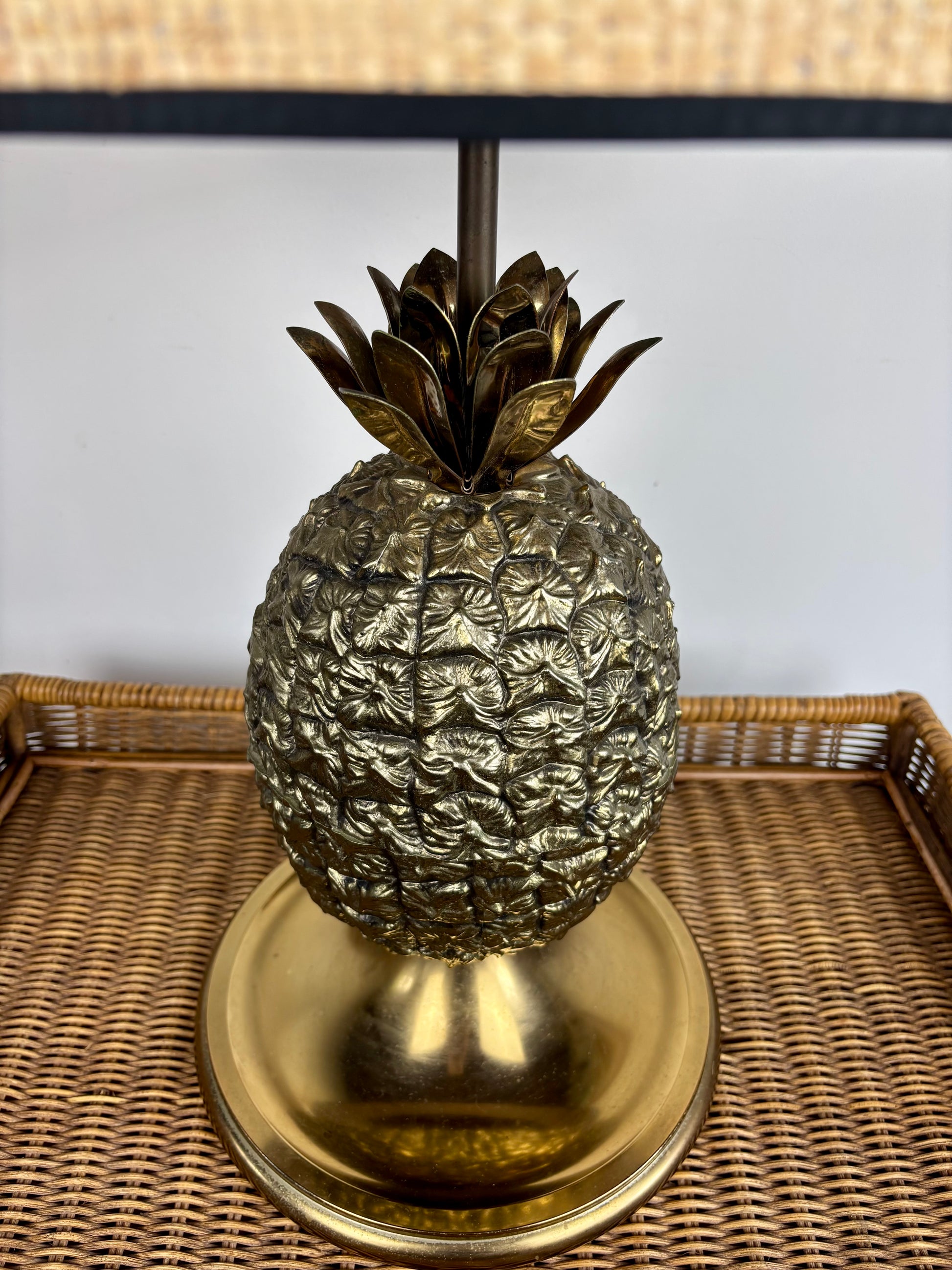 Fabuleuse lampe en laiton des années 70 en forme d’ananas, dont le décor finement texturé capte joliment la lumière. Son pied sculptural et son abat-jour en fibre naturelle diffusent une lumière douce et chaleureuse.