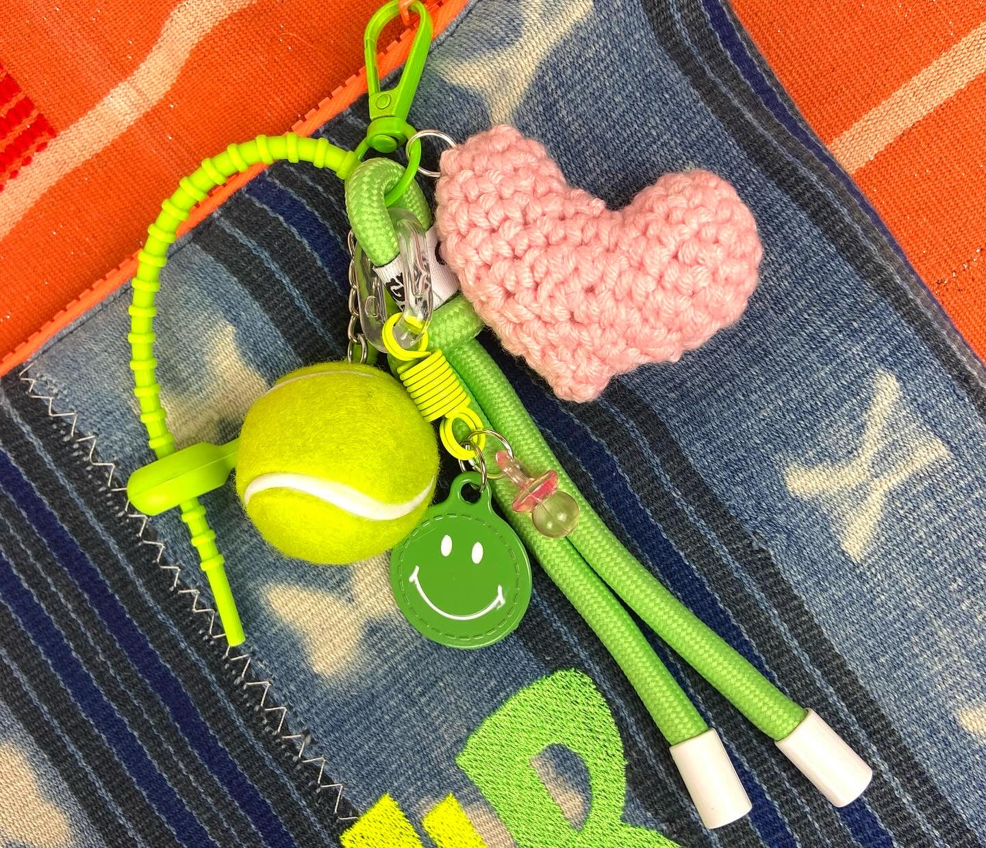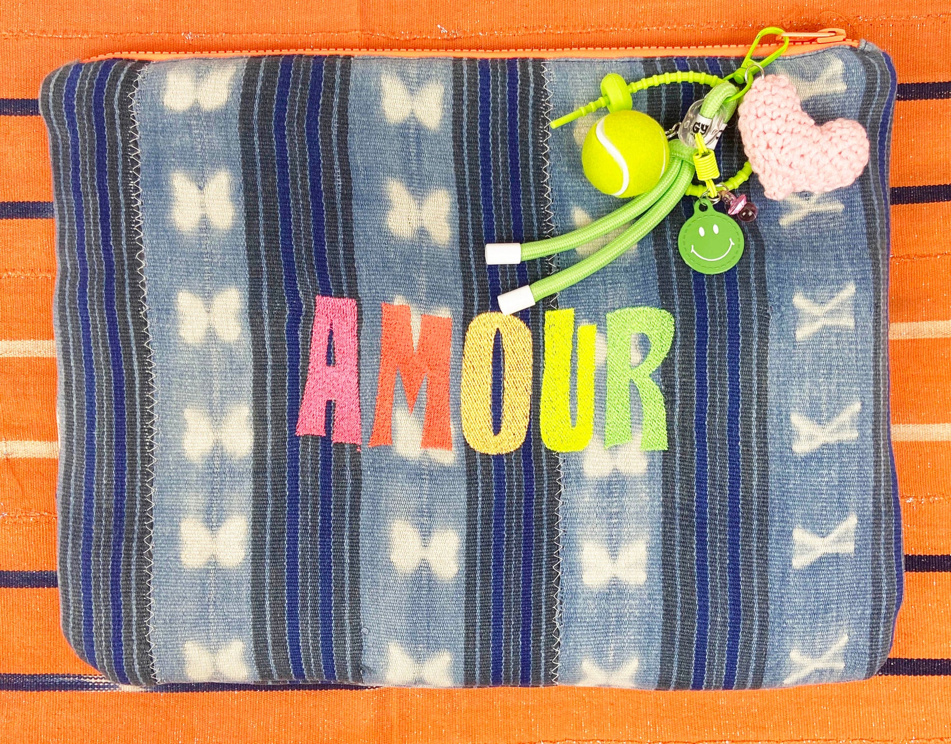 Lola est une pochette en coton tissé et teint en indigo à la main. Ces toiles d'Afrique de l'Ouest vintages montrent des patines et nuances subtiles de bleus, qui les rendent uniques. Elle est vendue avec ses grigris (smiley, balle de tennis, cœur crocheté, totoche, cordelette nouée et lien en caoutchouc) dans les tons jaune, vert et rose.