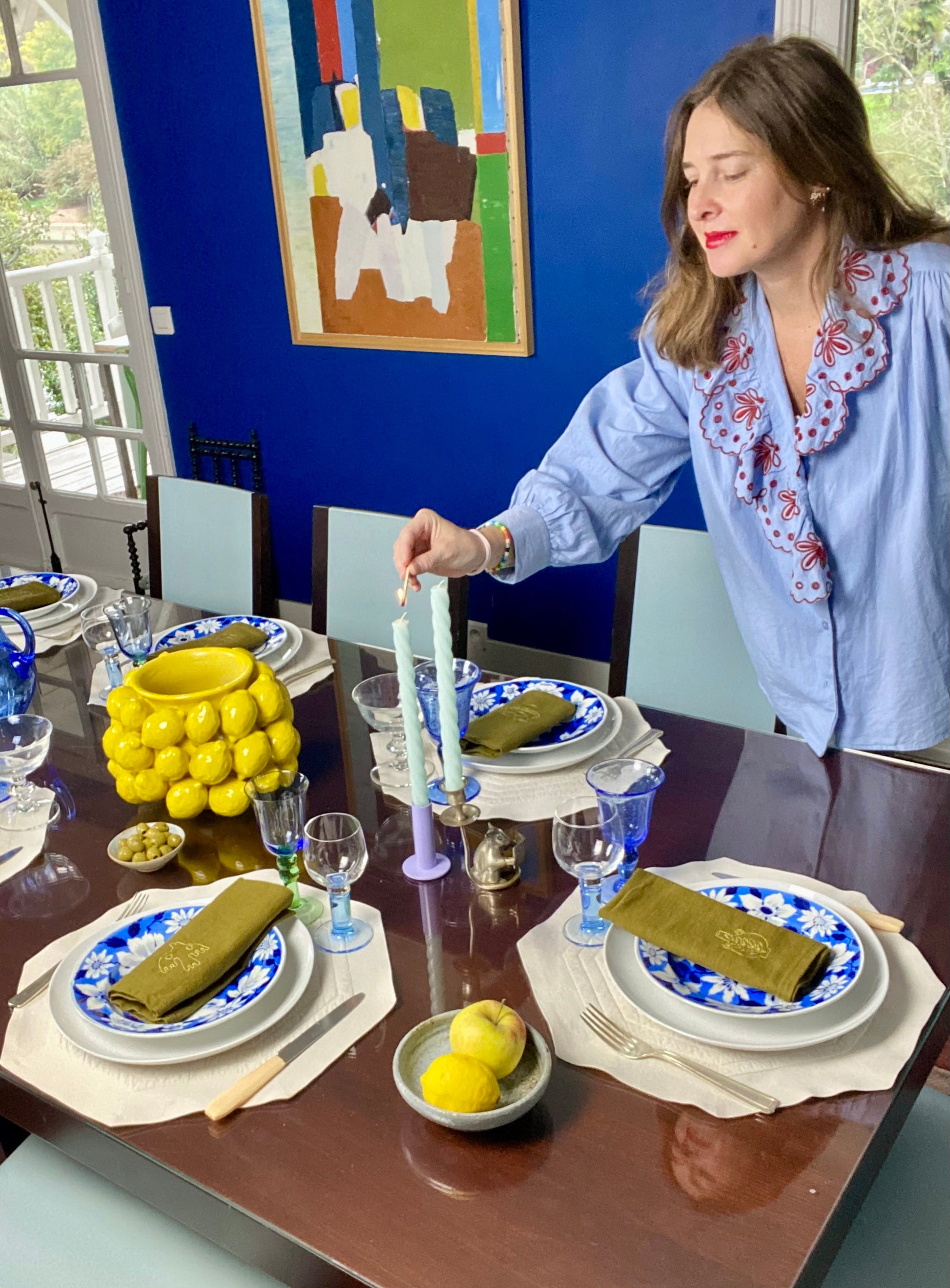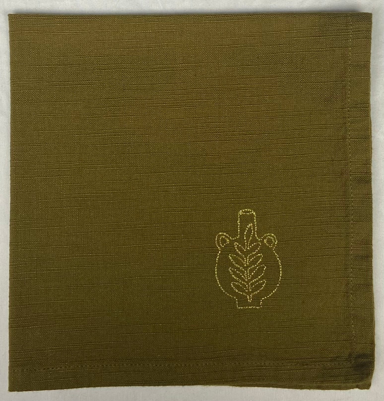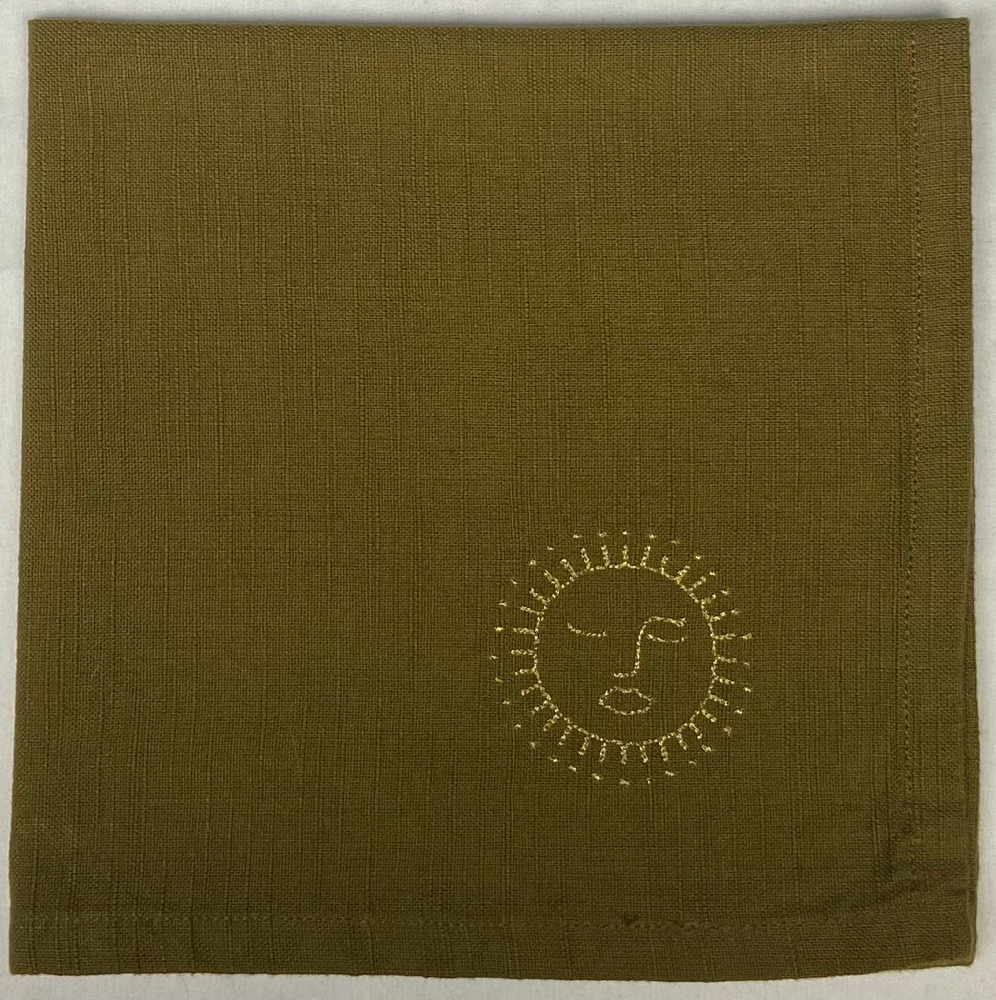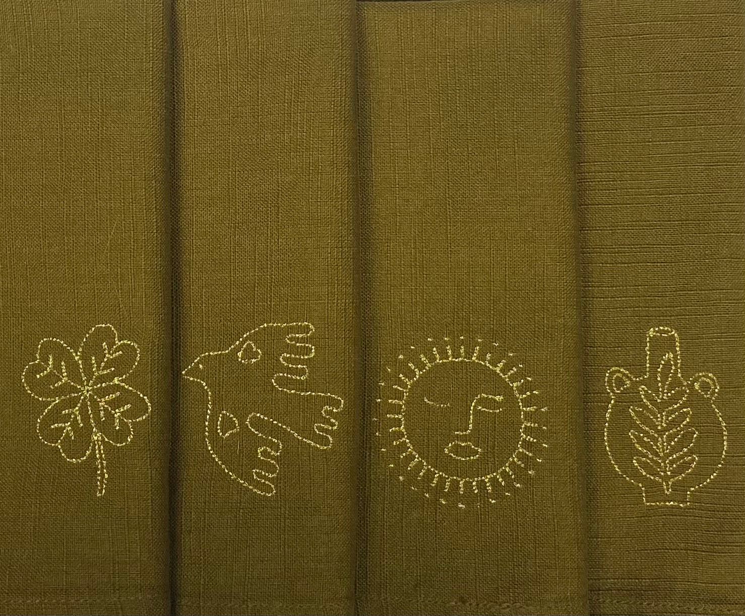 Sous le soleil du Sud : ce set de 4 serviettes en coton olive est brodé de symboles solaires en doré — une colombe, un trèfle à quatre feuilles, un vase orné d'une branche d'olivier et un soleil.