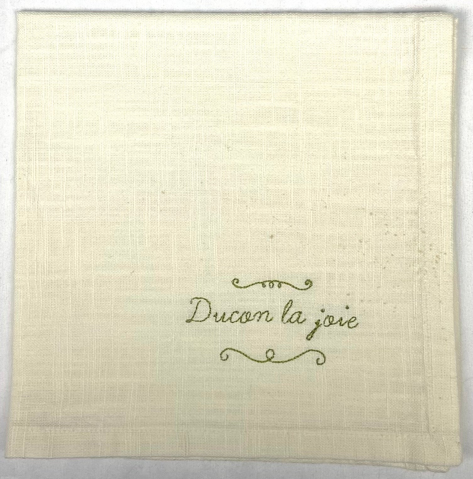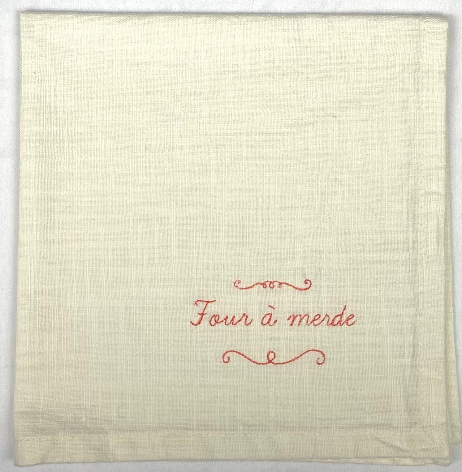 Ajoutez une touche d'irrévérence à vos dîners ! En coton crème tout doux, les serviettes de table Noli cachent un humour bien piquant avec leurs insultes brodées élégamment assumées : ducon la joie, bourse molle, four à merde et peigne cul.