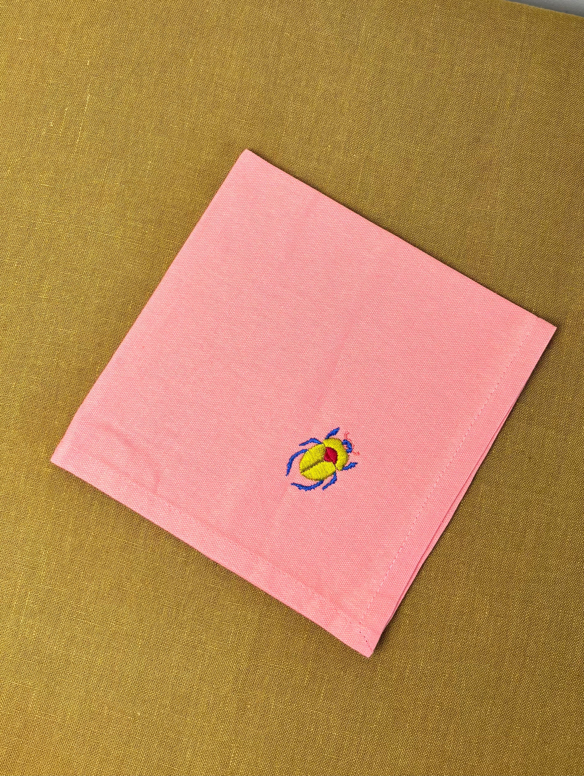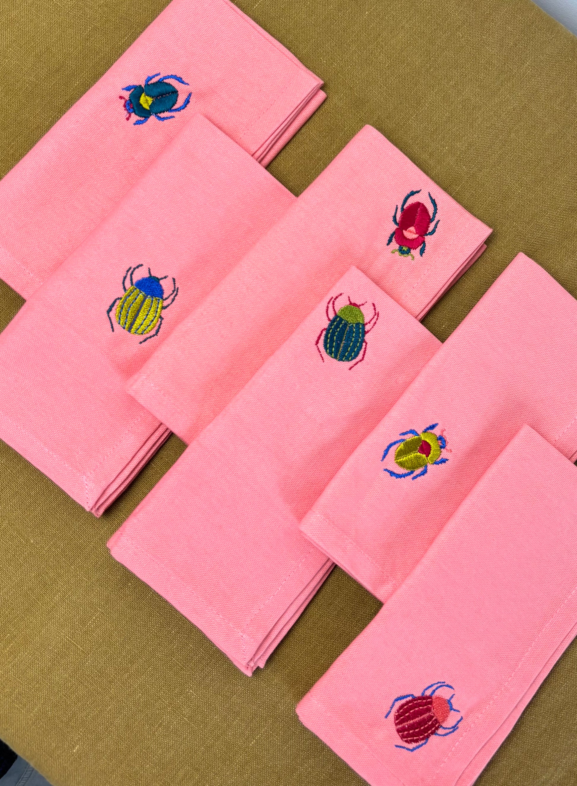 Set de six serviettes de table en coton rose, chacune brodée d’un scarabée coloré aux détails délicats. La douceur du tissu contraste joliment avec les broderies vibrantes, qui apportent une touche à la fois élégante et inattendue à la table.